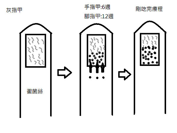 若灰指甲侵犯至指根,通常需要使用口服藥物,在口服藥物方面,健保給付的有terbinafine及itraconazole,terbinafine每天服用一顆,itraconazole 1天服用1至2次、共服2顆,治療手部灰指甲約須6周,灰指甲療程約須12周,若規律用藥,約有7至8成患者可得到痊癒,